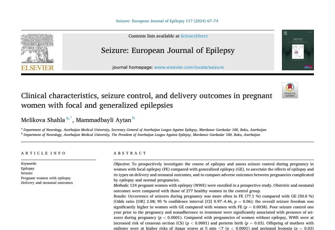 2024-cü ildə müəlliflərin növbəti elmi işi — “Clinical characteristics, seizure control, and delivery outcomes in pregnant women with focal and generalized epilepsies” adlı məqalə artıq ikinci dəfə “Seizure: European Journal of Epilepsy” jurnalında dərc edilib. Bu tədqiqatda hamilə qadınlarda epilepsiyanın klinik xüsusiyyətləri, eləcə də epilepsiyanın müxtəlif formalarının hamiləlik və doğuş nəticələrinə təsiri ilk dəfə olaraq ətraflı şəkildə araşdırılıb və elmi şəkildə əsaslandırılıb.