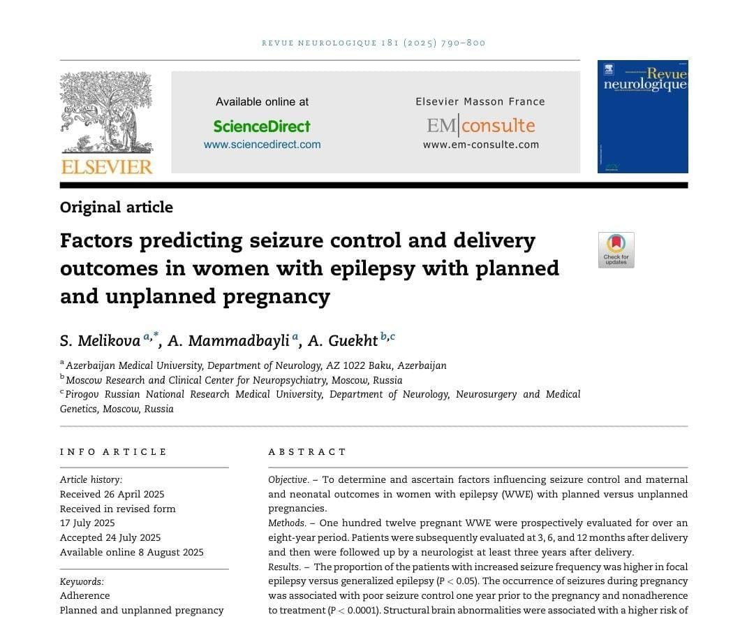 ATU-nun Nevrologiya kafedrasının müdiri, professor Aytən Məmmədbəyli və həmin kafedranın dosenti Şəhla Məlikovanın müəllifliyi ilə hazırlanan “Factors predicting seizure control and delivery outcomes in women with epilepsy with planned and unplanned pregnancy” adlı elmi məqalə “Revue Neurologique” jurnalında dərc olunub.