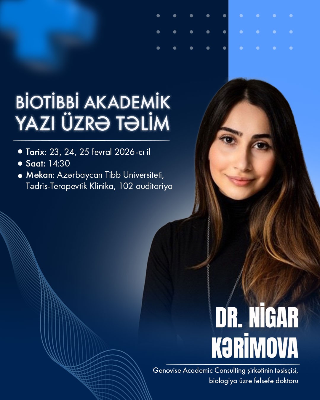 Təlim Genovise Academic Consulting şirkətinin təsisçisi, biologiya üzrə fəlsəfə doktoru Dr. Nigar Kərimova tərəfindən aparılacaqdır.