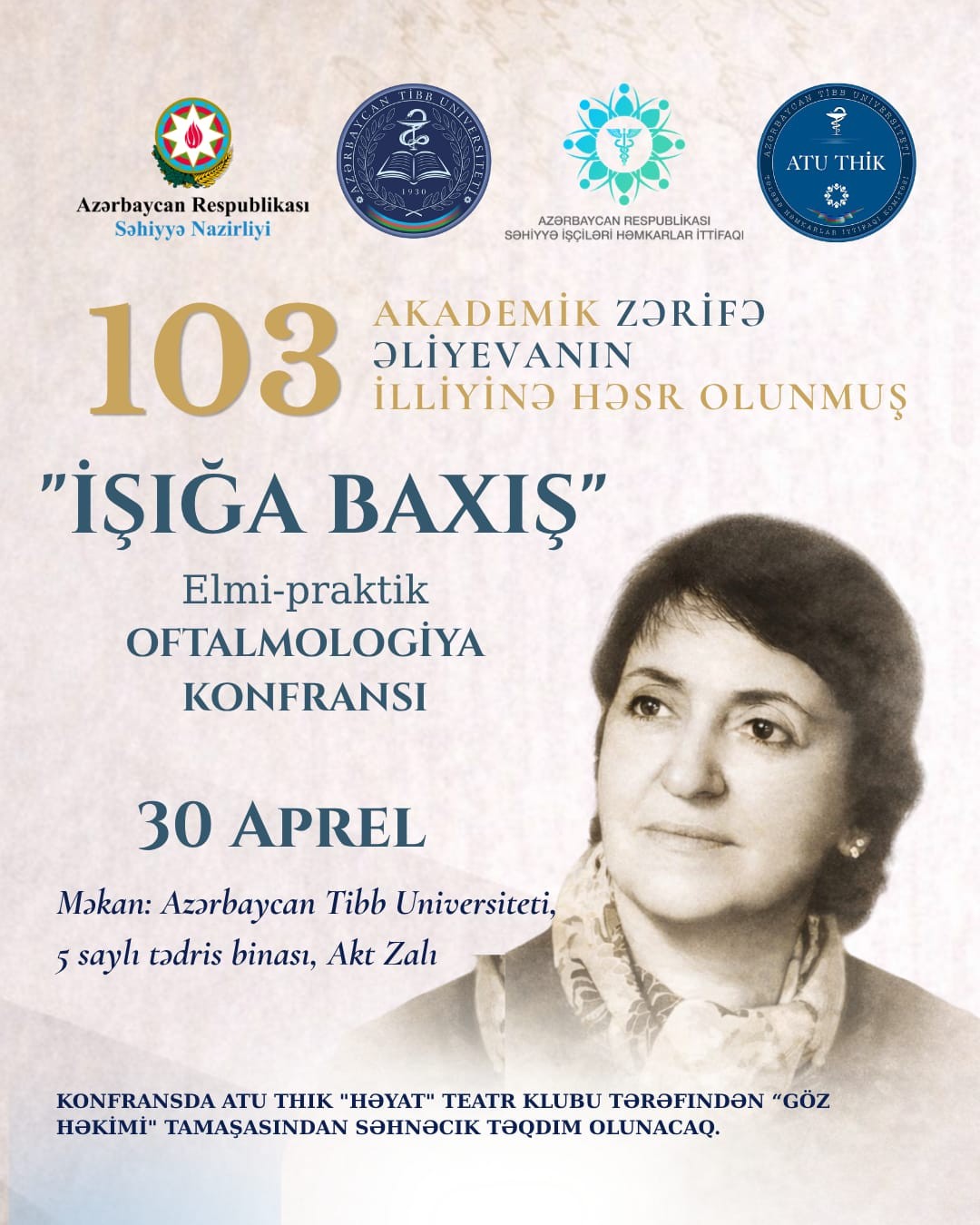 Azərbaycan Tibb Universitetinin Tələbə Həmkarlar İttifaqı Komitəsinin təşkilatçılığı və Oftalmologiya kafedrasının dəstəyi ilə 30 aprel tarixində Akademik Zərifə Əliyevanın 103 illiyinə həsr olunmuş "İşığa Baxış" adlı Oftalmologiya konfransı keçiriləcək.