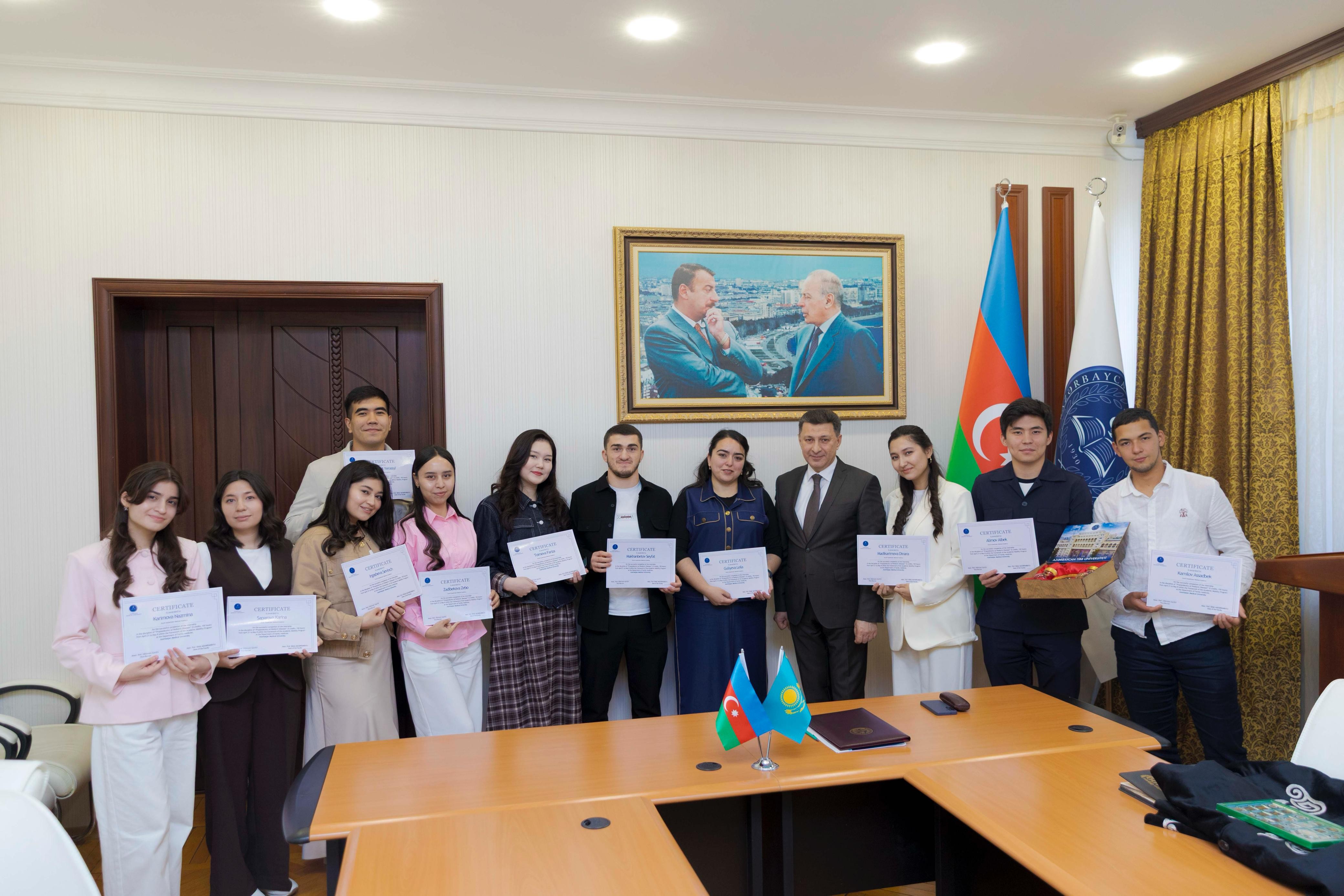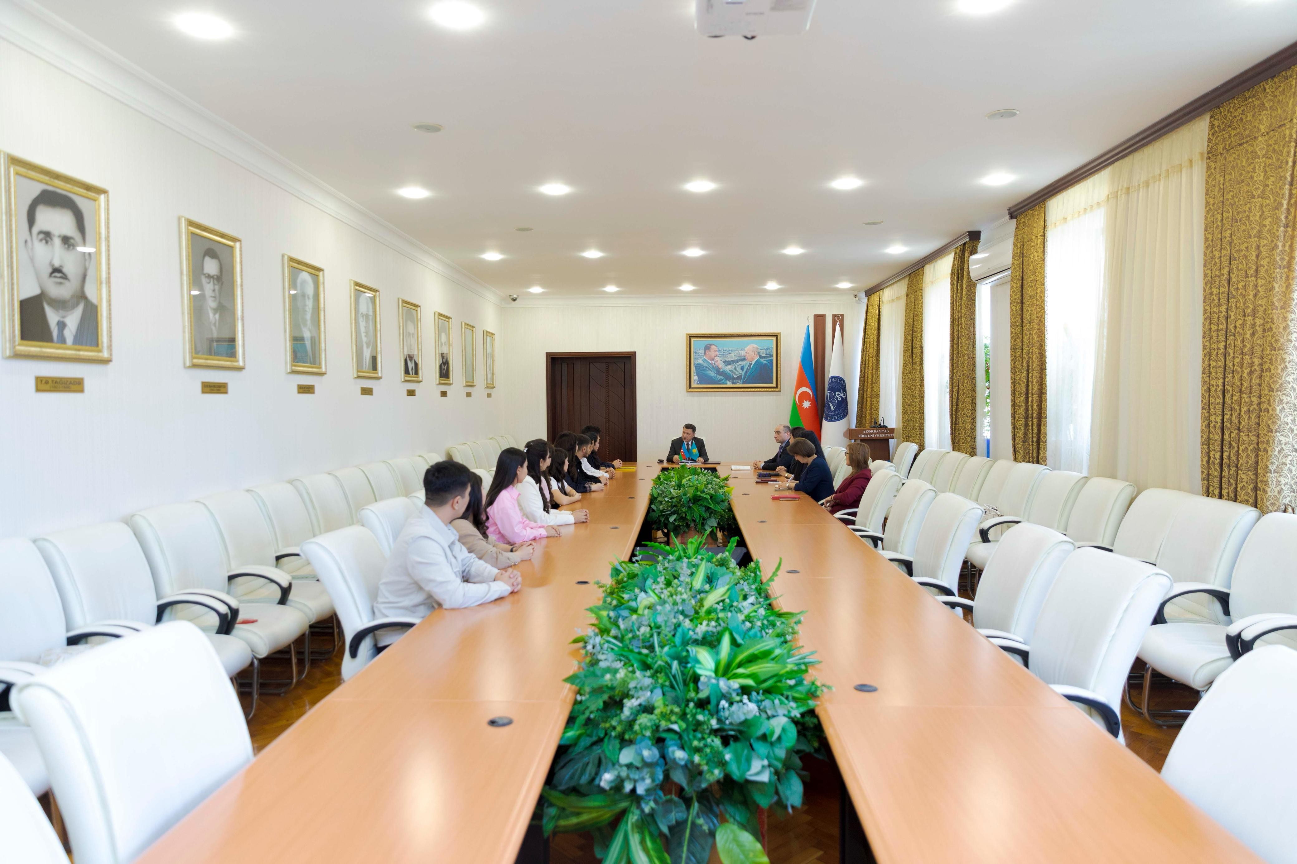 Qazaxıstan Respublikasının Cənubi Qazaxıstan Tibb Akademiyasının Tibb ixtisası üzrə təhsil alan III kurs tələbələri ilə keçirilən görüşdə rektor İki ölkə arasında bütün sferalarda irəliləyən yaxın dostluq münasibətlərindən söz açıb.