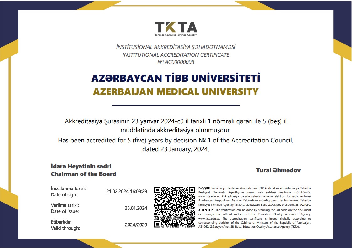 AZƏRBAYCAN TİBB UNİVERSİTETİ ALİ TƏHSİL MÜƏSSİSƏLƏRİNİN AKKREDİTASİYASI İLƏ BAĞLI NÖVBƏTİ NAİLİYYƏTİ ƏLDƏ EDİB